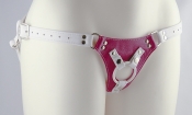 The Pink Candy Jag is fresh, with a sexy Pink leather base accented with luxe white leather straps and a white o ring to show off your favorite toy