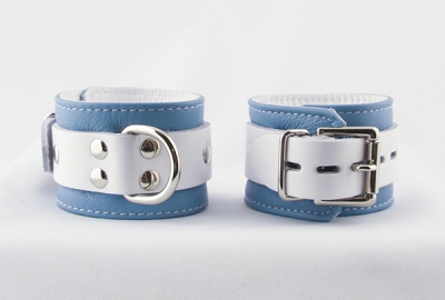 New Crystal Blue Cuffs - fresh and sexy Blue leather base accented with a heavy white leather strap. These cuffs are 2" wide and they have locking buckles for extra security. Perfect for those new to bondage, these attractive cuffs are a great addition to your toybox and your party wardrobe. The nickel plated steel D ring is a secure attachment point and the inner side is lined with soft vegan leather to protect the skin.