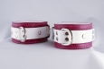 New Pink Candy Cuffs - fresh and sexy Pink leather base accented with a heavy white leather strap. These cuffs are 2" wide and they have locking buckles for extra security. Perfect for those new to bondage, these attractive cuffs are a great addition to your toybox and your party wardrobe. The nickel plated steel D ring is a secure attachment point and the inner side is lined with soft vegan leather to protect the skin.